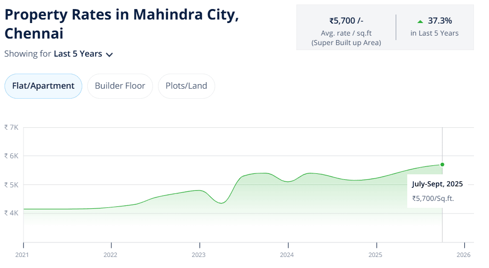 In terms of price appreciation, flat rates in Mahindra City have increased by 10.7 % in the last 1 year, 21.3 % in the last 3 years, 37.3 % in the last 5 year and 42.5 % in the last 10 years.